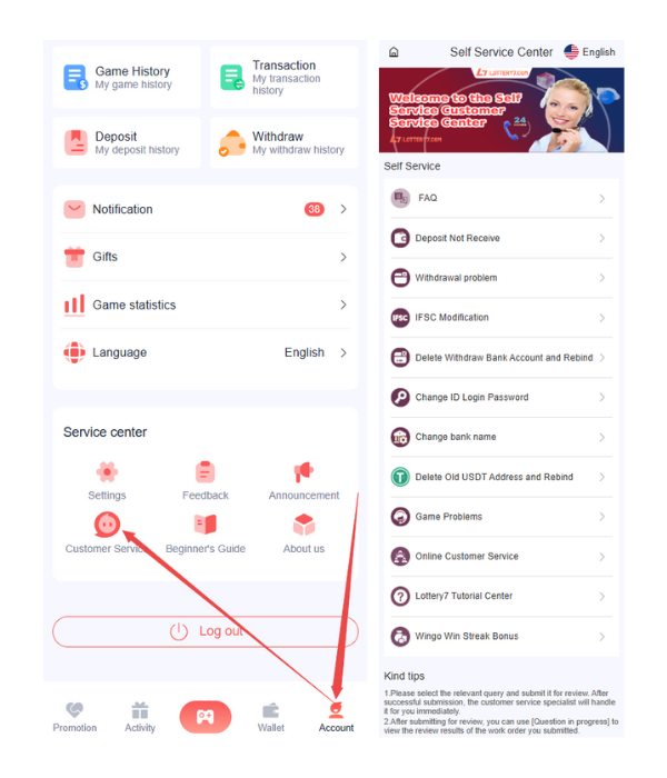 Lottery 7 also provides a Self-Service Center, where deposit and withdrawal issues can be resolved directly with system assistance. You can access it via: